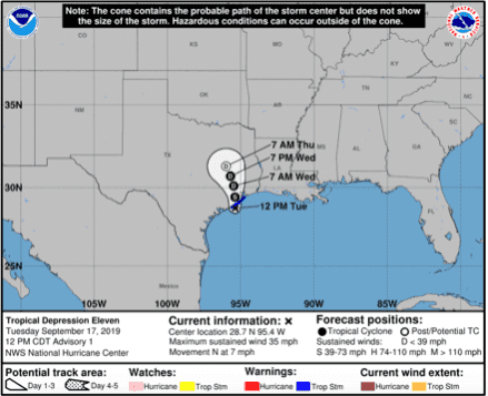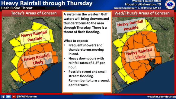 Wed, September 18, 2019 0900 Update: Tropical Storm Imelda has been downgraded to a tropical depression. Widespread rainfall continues today and the National Weather Service has issued a Flash Flood Watch for Harris County until 7:00 AM Thursday.