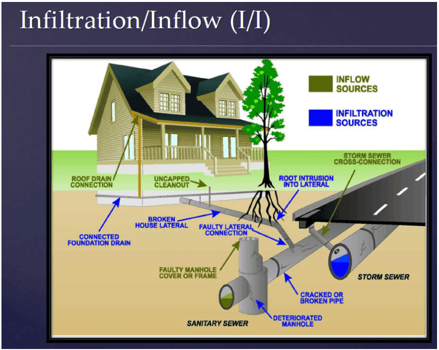 Infiltration is groundwater that enters the sewer system through leaks in your service lines or the main sanitary sewer lines. Aging infrastructure plays a big role in contributing to Infiltration for many Water Districts.