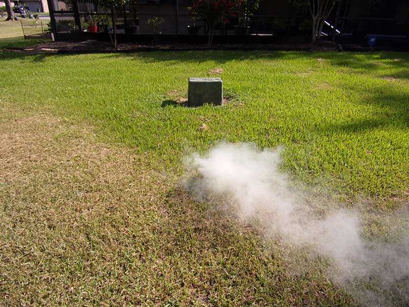 method of inspecting both the main lines and laterals. Smoke travels throughout the system, identifying problems in all connected lines—even sections of line that were not known to exist or thought to be independent or unconnected. Best results are obtained during dry weather, which allows smoke better opportunity to travel to the surface.