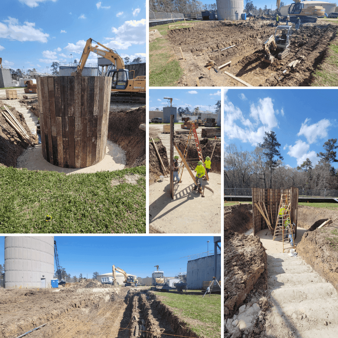 The contractor began work in February. Underground utilities were located and rerouted to make way for the proposed filtrate pump station. The necessary preliminary excavation has been completed for the pump station and now the contractor is working on preparing the concrete forms and rebar for the structure. For scale, the structure is 12-foot wide in diameter wide with 18-inch thick walls and will be 18 feet deep.