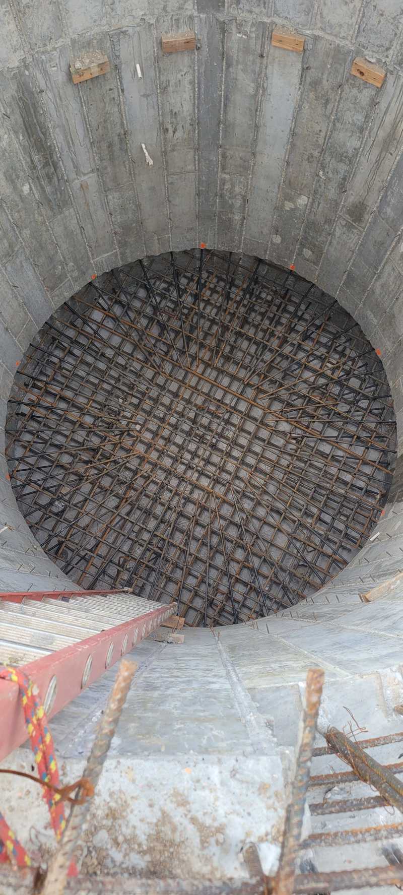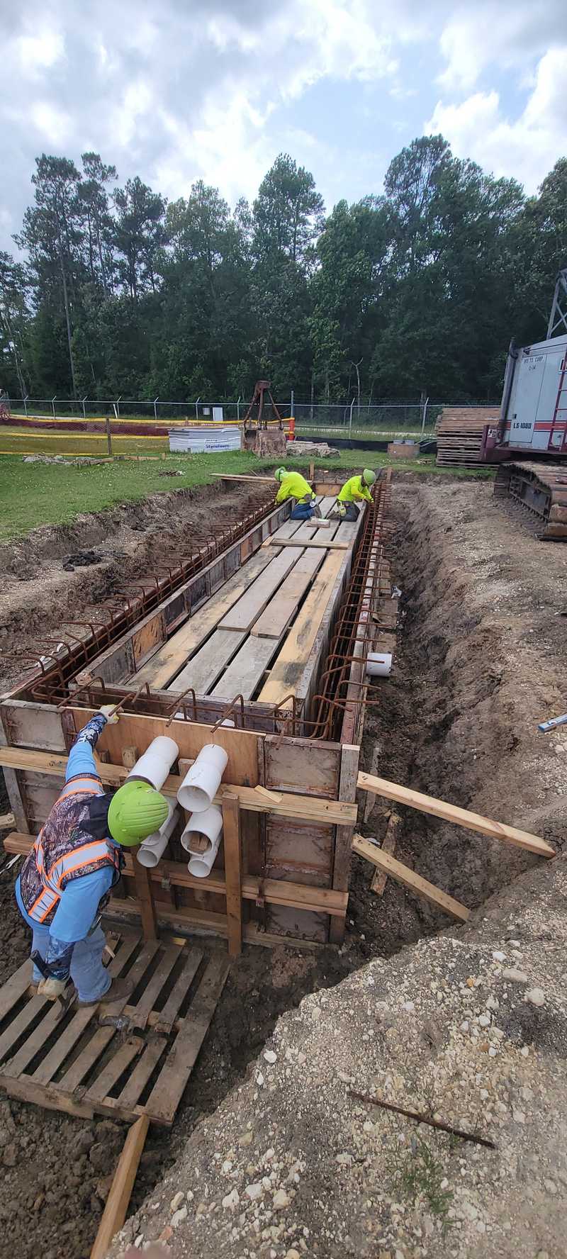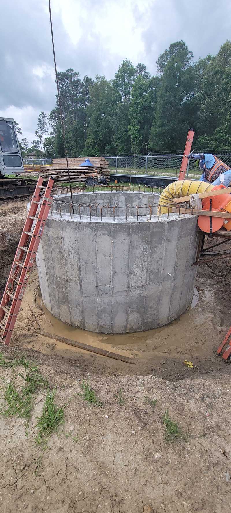 In April, when it wasn’t raining, the contractor formed and poured the second and final section of the pump station structure. After the concrete cured, the contractor continued sinking the structure to its planned depth. The second section sunk much faster than the first due to the saturated soils from all the rain. Upon reaching the specified depth, the base slab or “floor” of the structure was formed and poured. At the same time, work continued installing the filter building foundation and pipe trenches. The first trench has been poured and cured, and excavation for the second trench is underway.